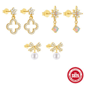 S925 Sterling Silver Classic Eight-Pointed Star Five-Petal Flower Tassel Earrings European and American Hot Selling Diamond-Studded Opal Pearl Earrings